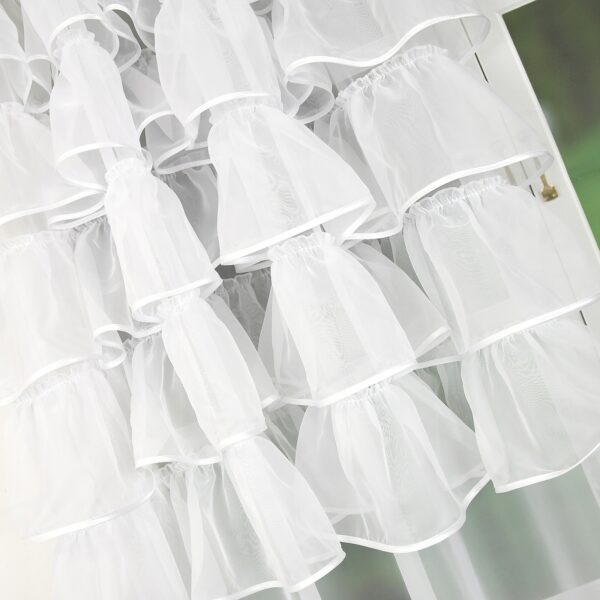 Firana uszyta z woalu, w górnej części drapowana w 5 rzędów falbanek