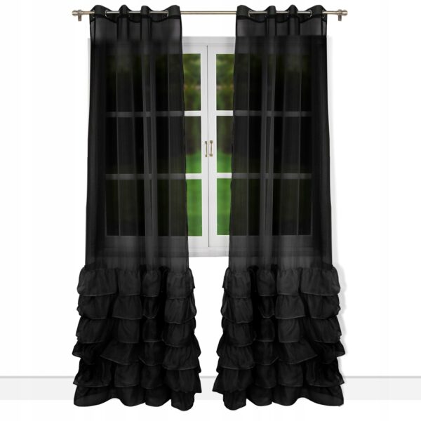 Czarna elegancka firana zdobiona falbanami na kółkach 145×250