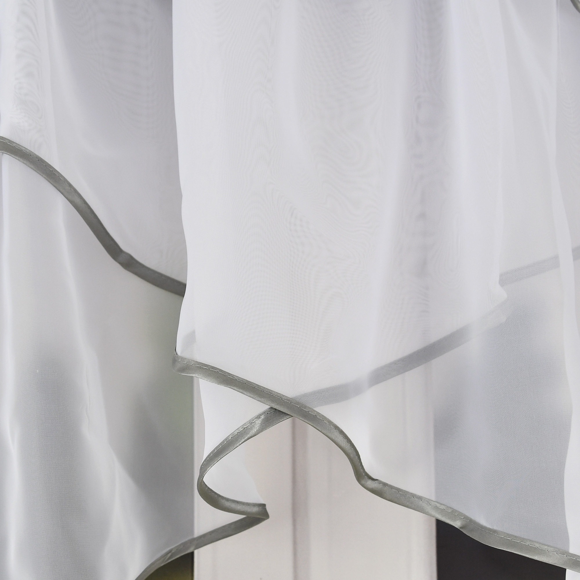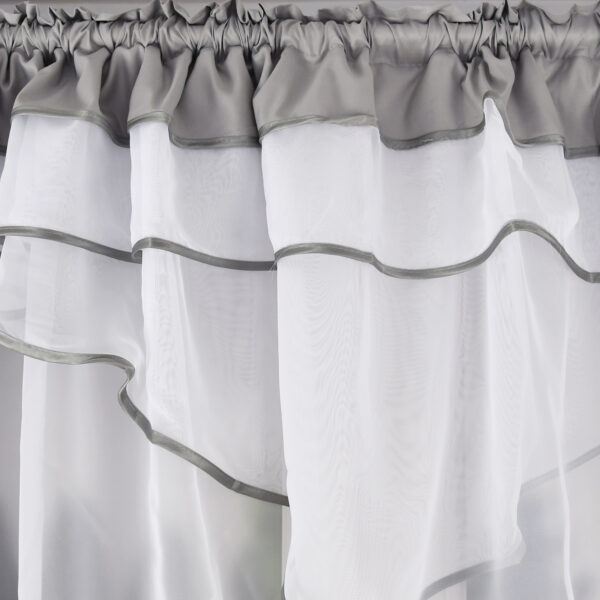 Środkowa część firany została wykonana z delikatnego, białego woalu i uszyta w charakterystyczny skośny wzór, który dodaje aranżacji lekkości i dynamiki. Zasłony uszyto z wysokiej jakości mikrofibry, co zapewnia piękne układanie się materiału oraz trwałość.