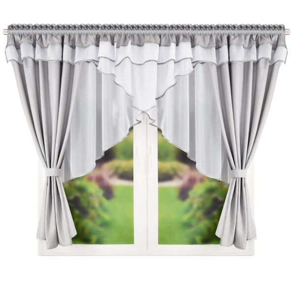 Komplet dekoracyjny na okno – firana gotowa z zasłonami zdobiona lambrekinem