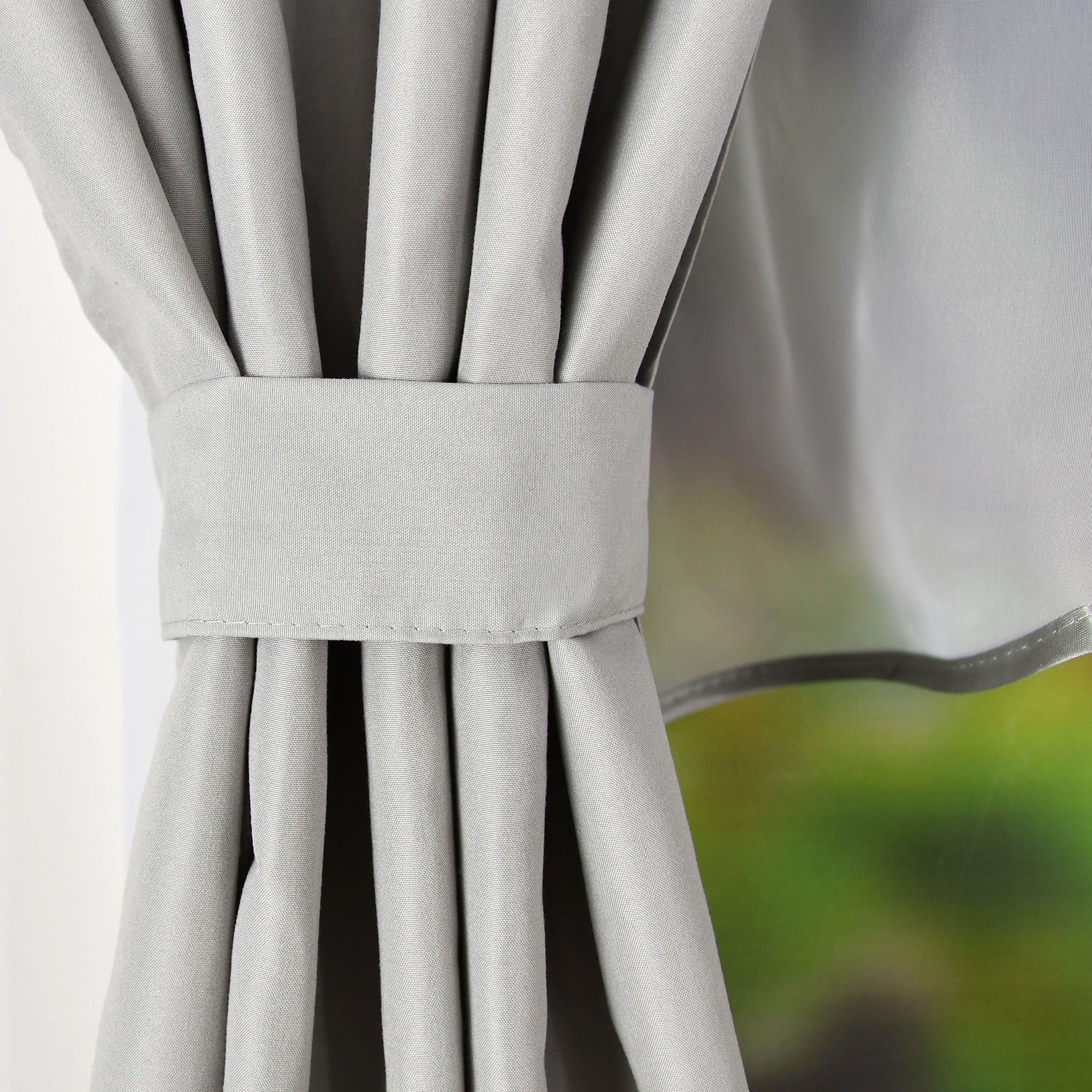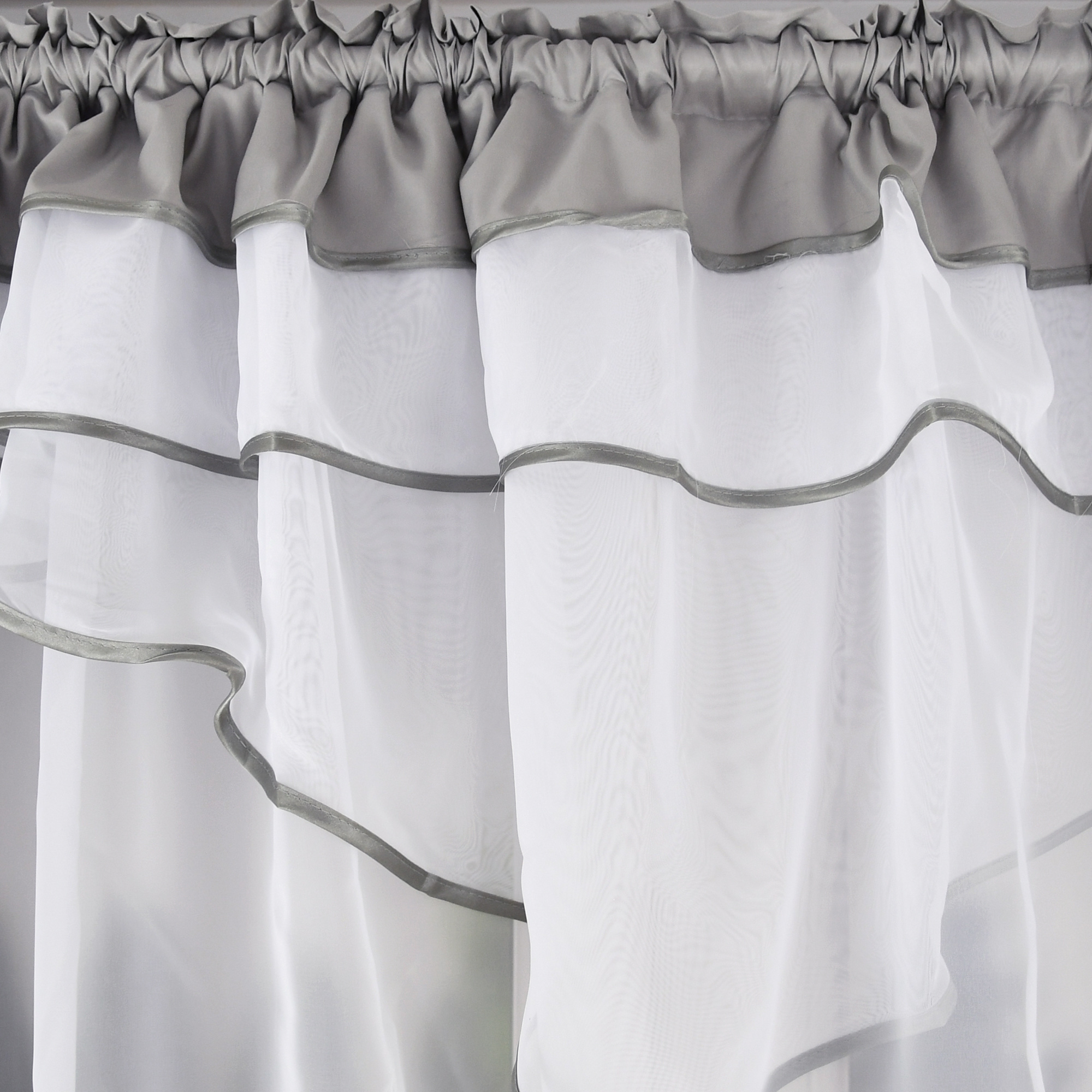 Górę zestawu zdobi subtelny lambrekin, który nadaje całości eleganckiego wykończenia. W komplecie znajdują się także ozdobne tasiemki, umożliwiające efektowne upięcie zasłon w kokony.