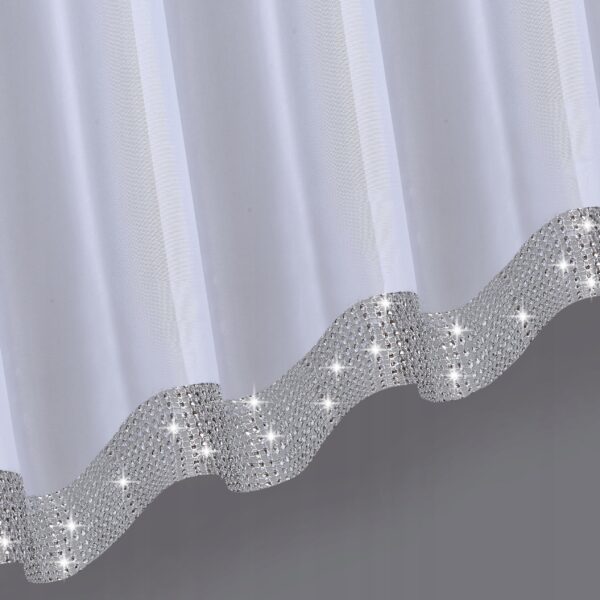Gotowa firana uszyta w kształcie litery U z wysokiej jakości woalu w kolorze białym, z delikatnym zdobieniem z cyrkonii o szerokości 3 cm oraz 6 cm.