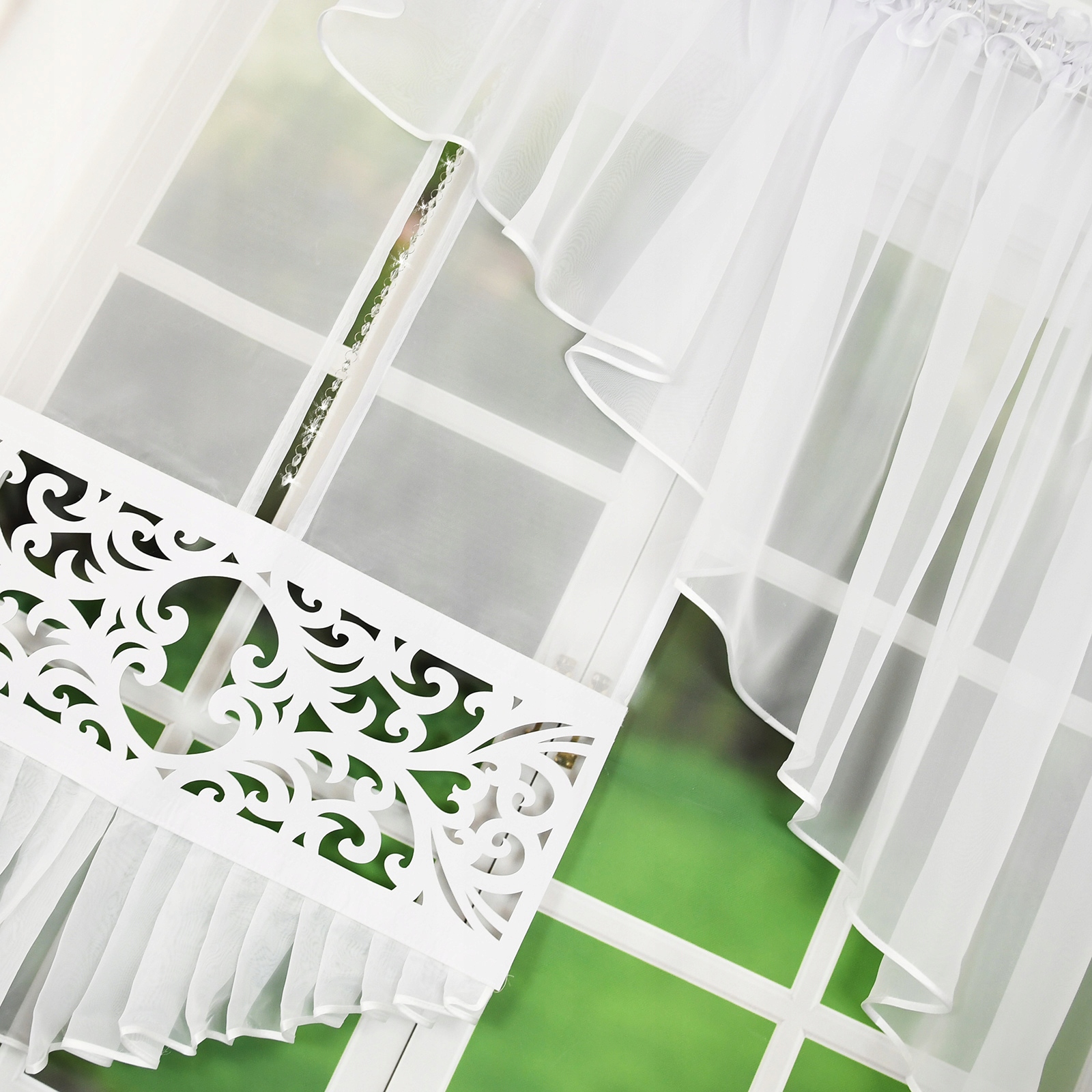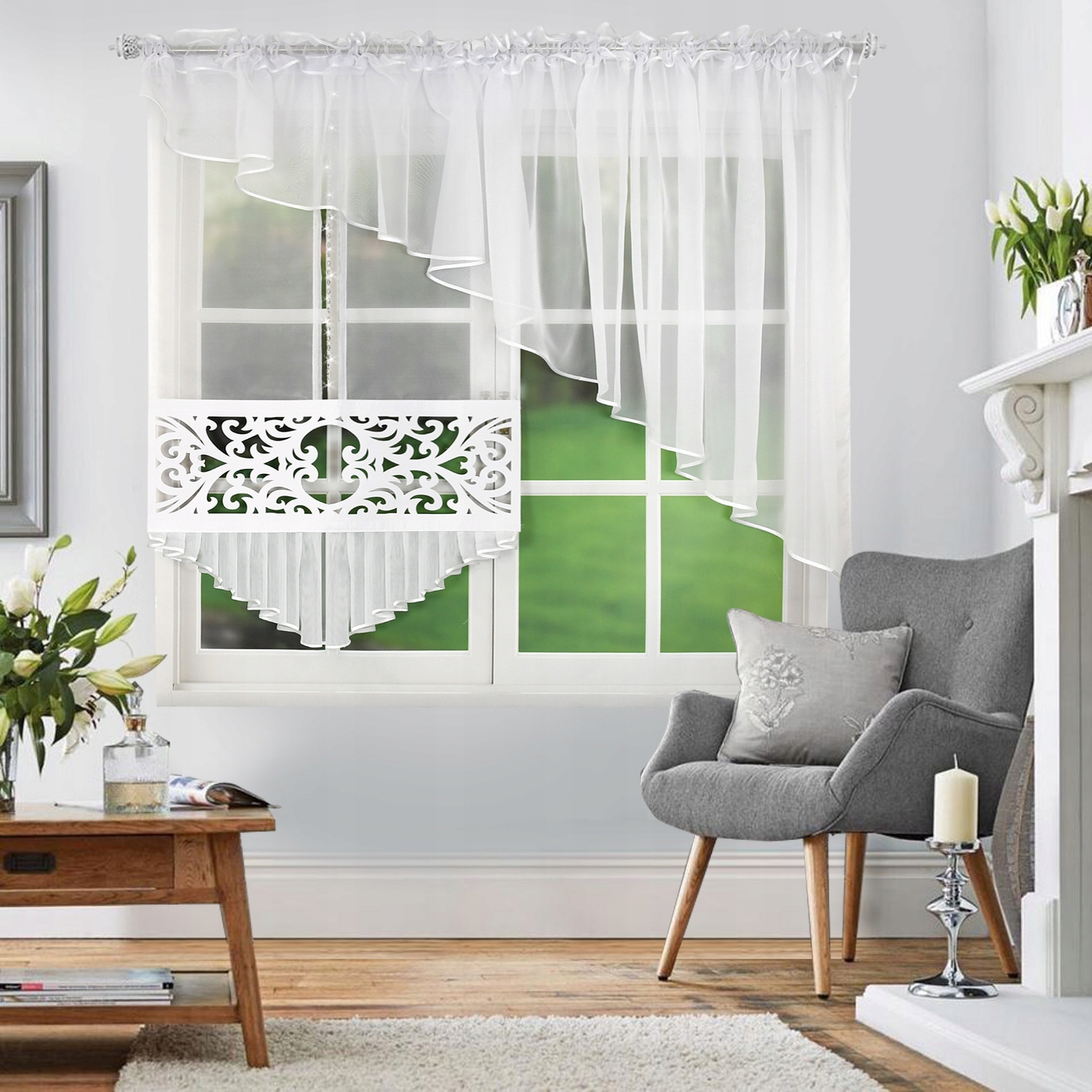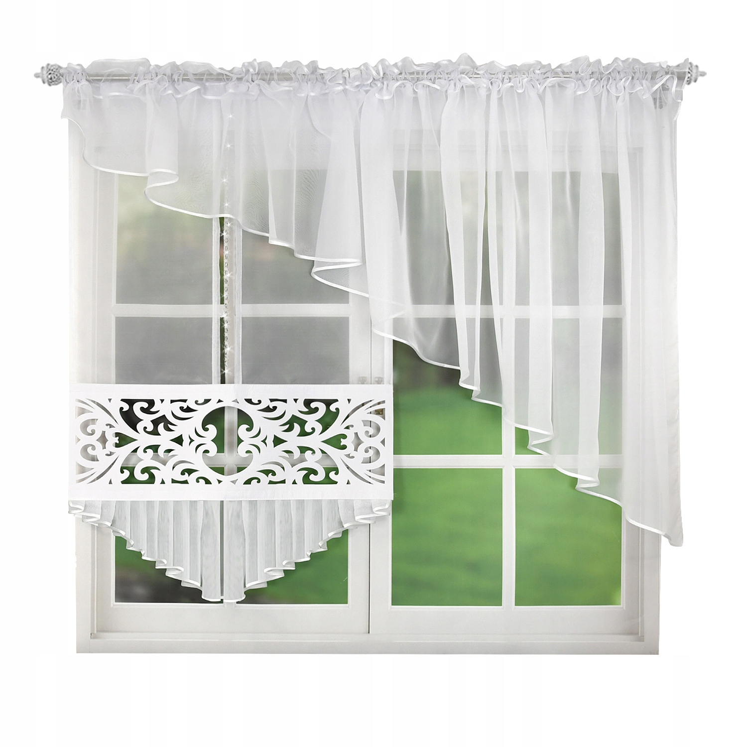 Zestaw dekoracyjny składa się z dwóch niepołączonych części. Wyjątkowa firana uszyta w skos z gładkiego woalu, zdobiona zawieszką z koralikami oraz panel ażurowym z filcu wycinany metodą laserową. Boki i dół firany wykończone lamówką.