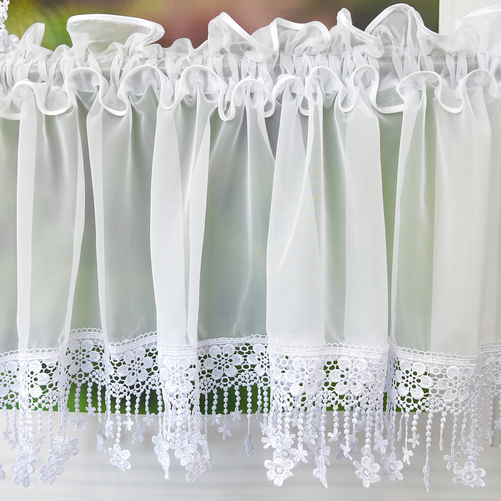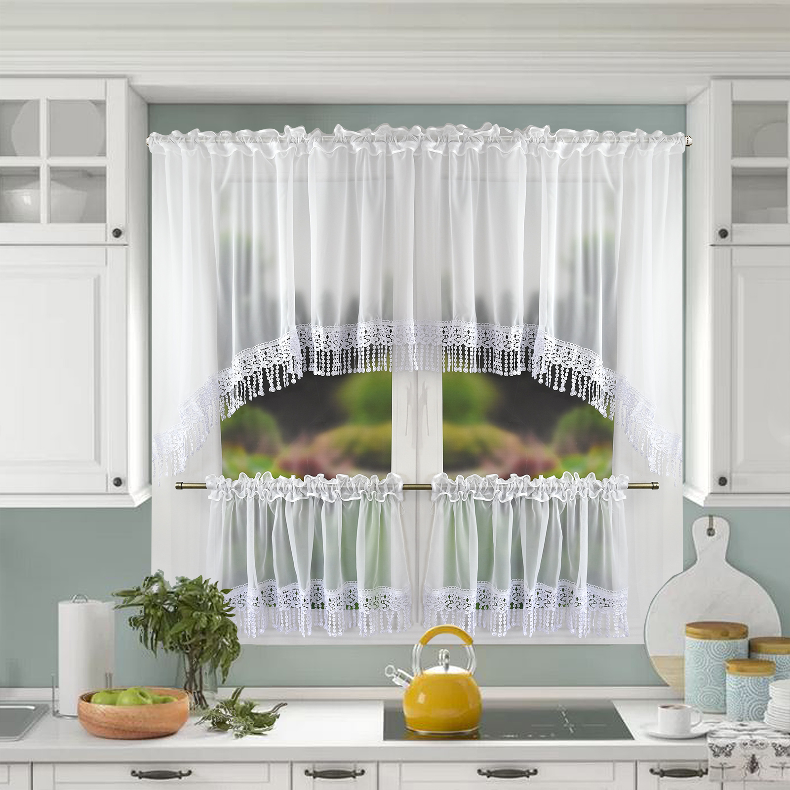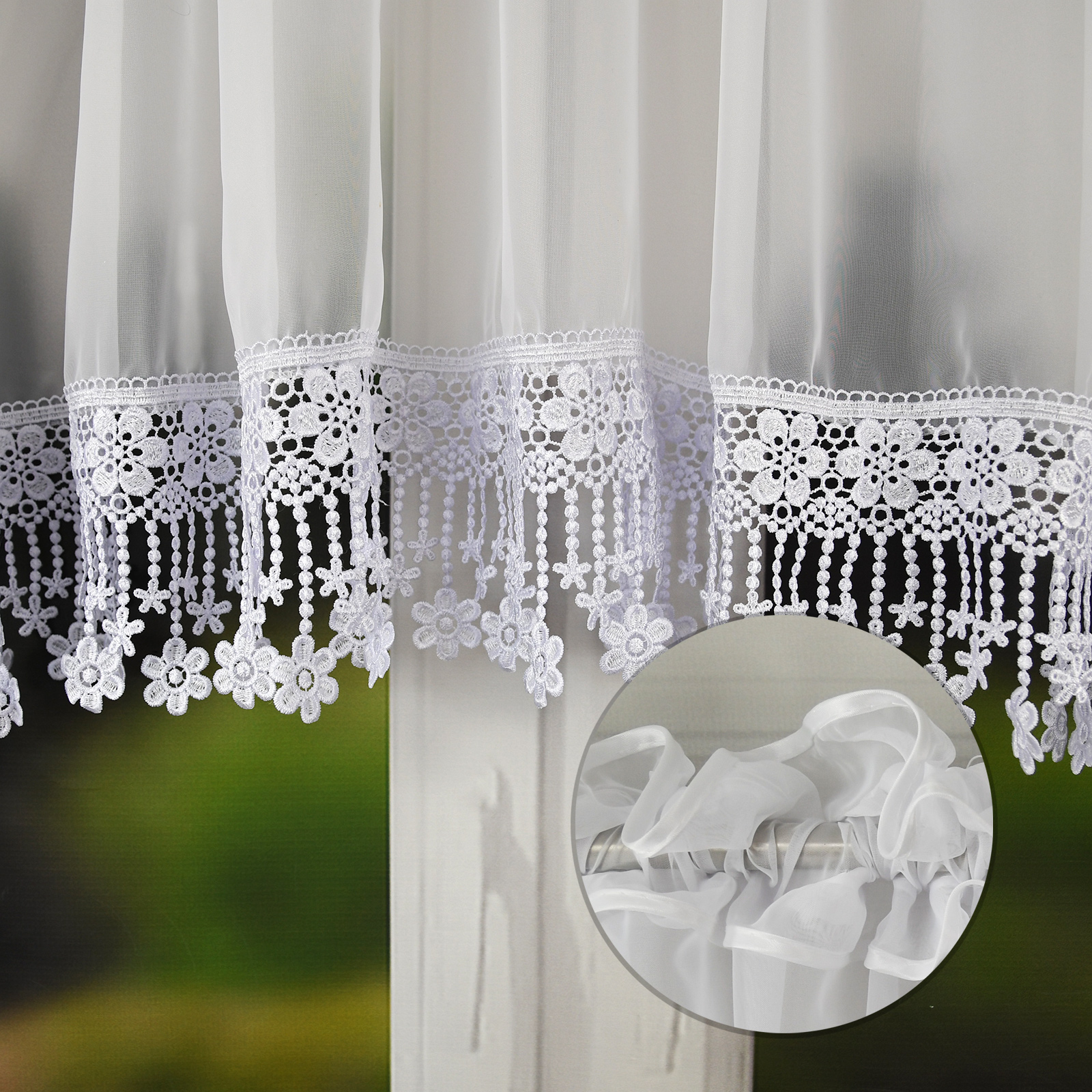 Firana z gipiurą i zazdrostkami – wykonana z woalu, idealna do kuchni lub jadalni
