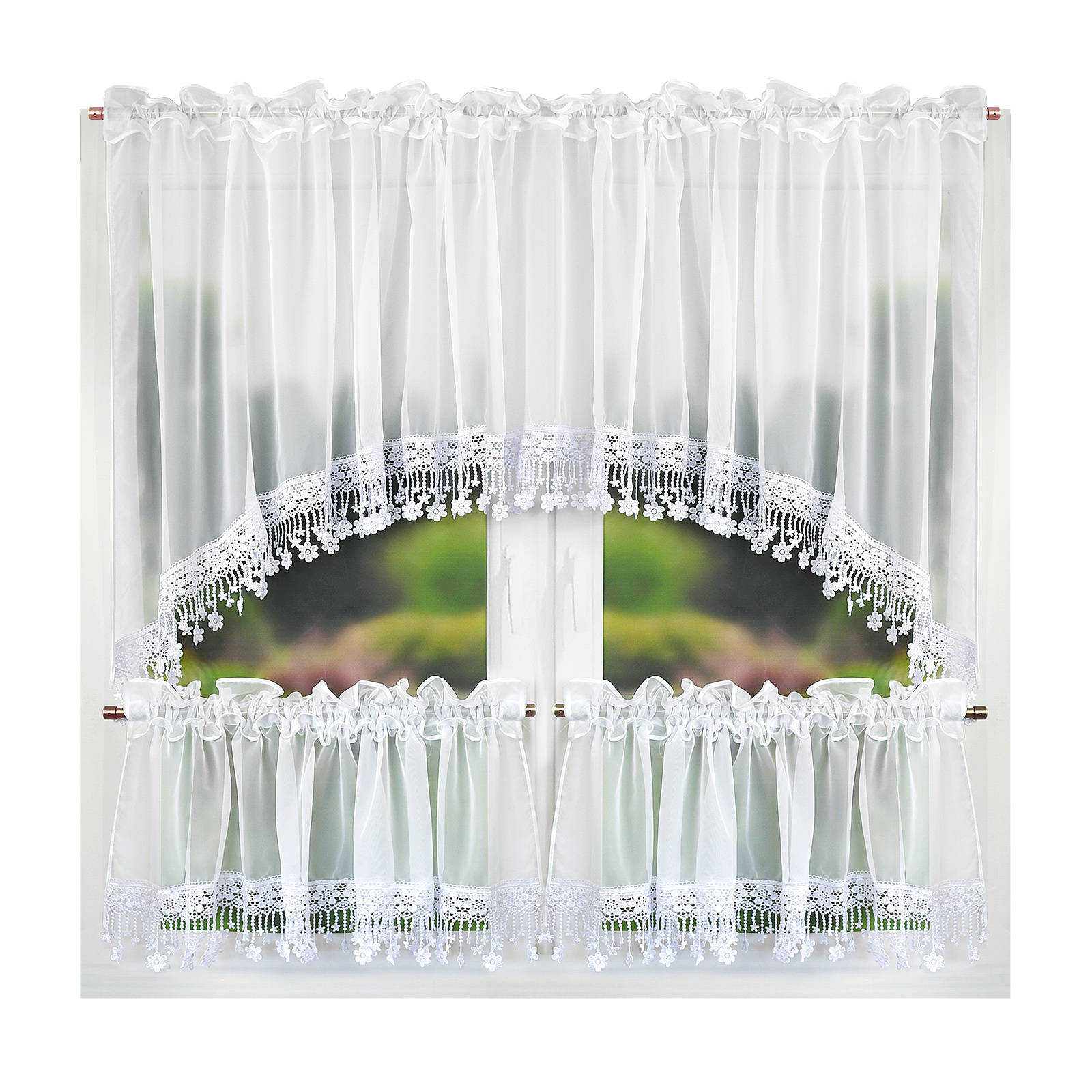 Firana w łuk z woalu wraz z zazdrostką uzupełni dekorację okna zarówno w stylu klasycznym, jak i nowoczesnym. Idealnie nadaje się do kuchni, salonu, sypialni, jadalni lub pokoju dziecięcego. Elegancka gipiura z pewnością nada wnętrzu stylowego charakteru.