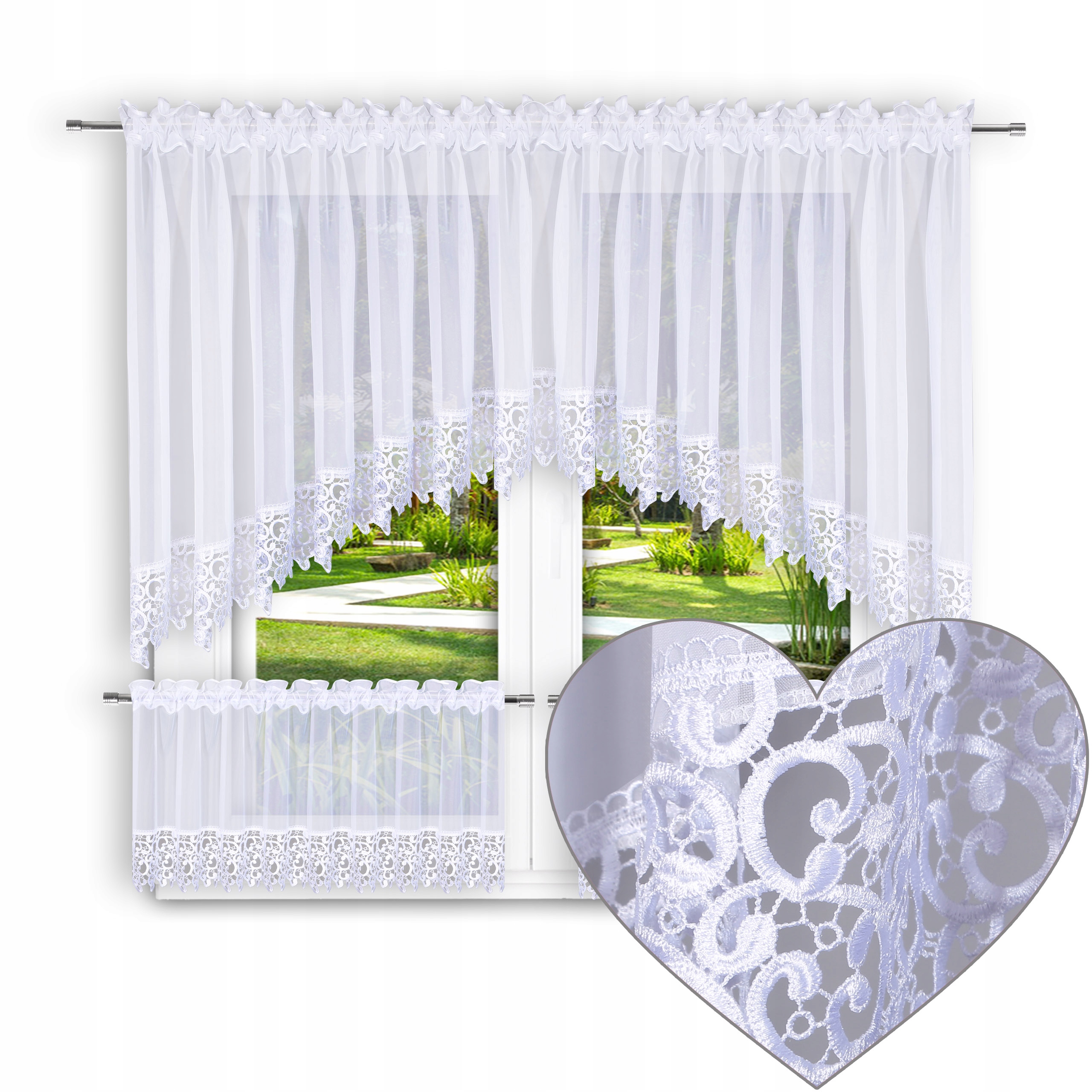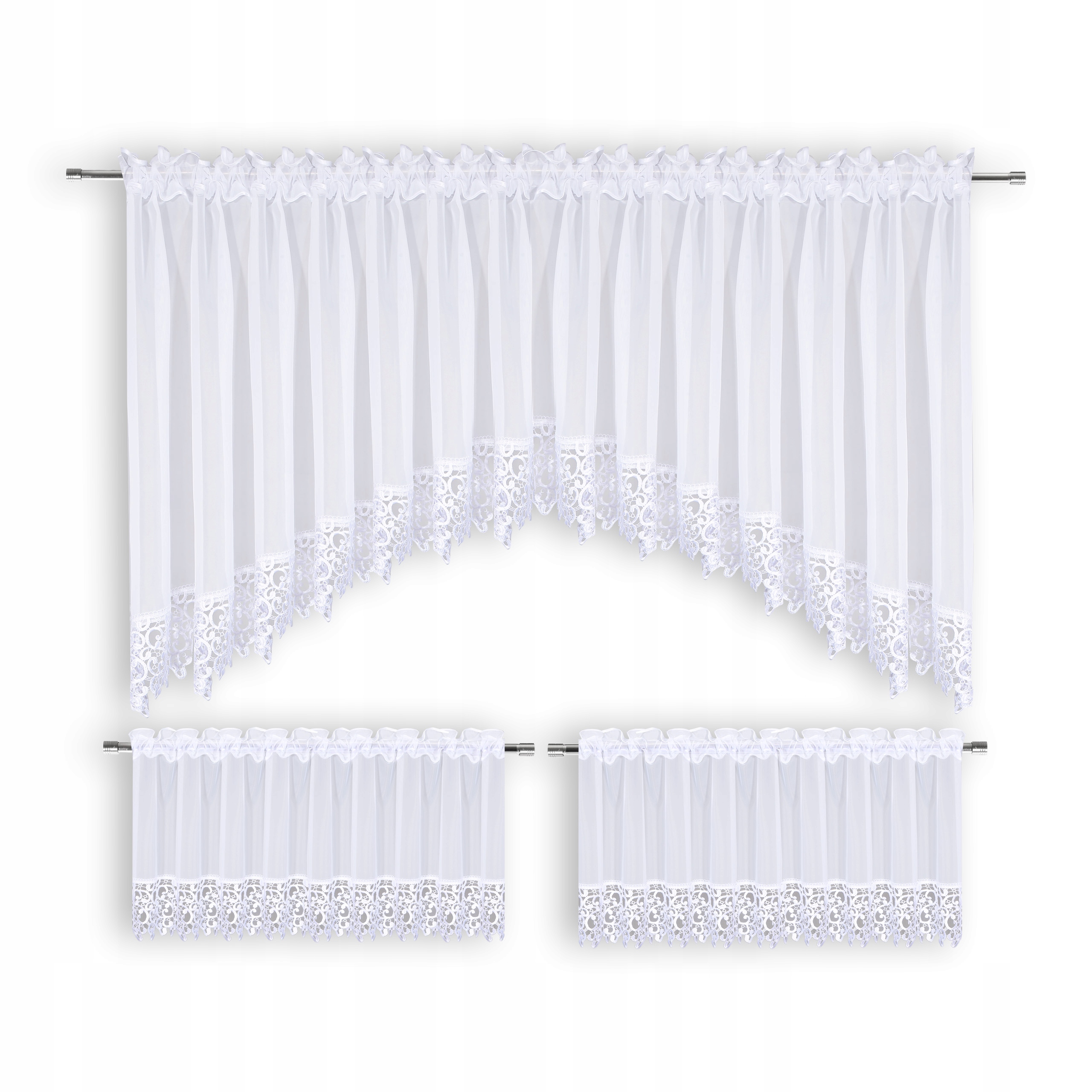 W komplecie znajdują się także 2 oddzielne woalowe zazdrostki, również obszyte gipiurą.