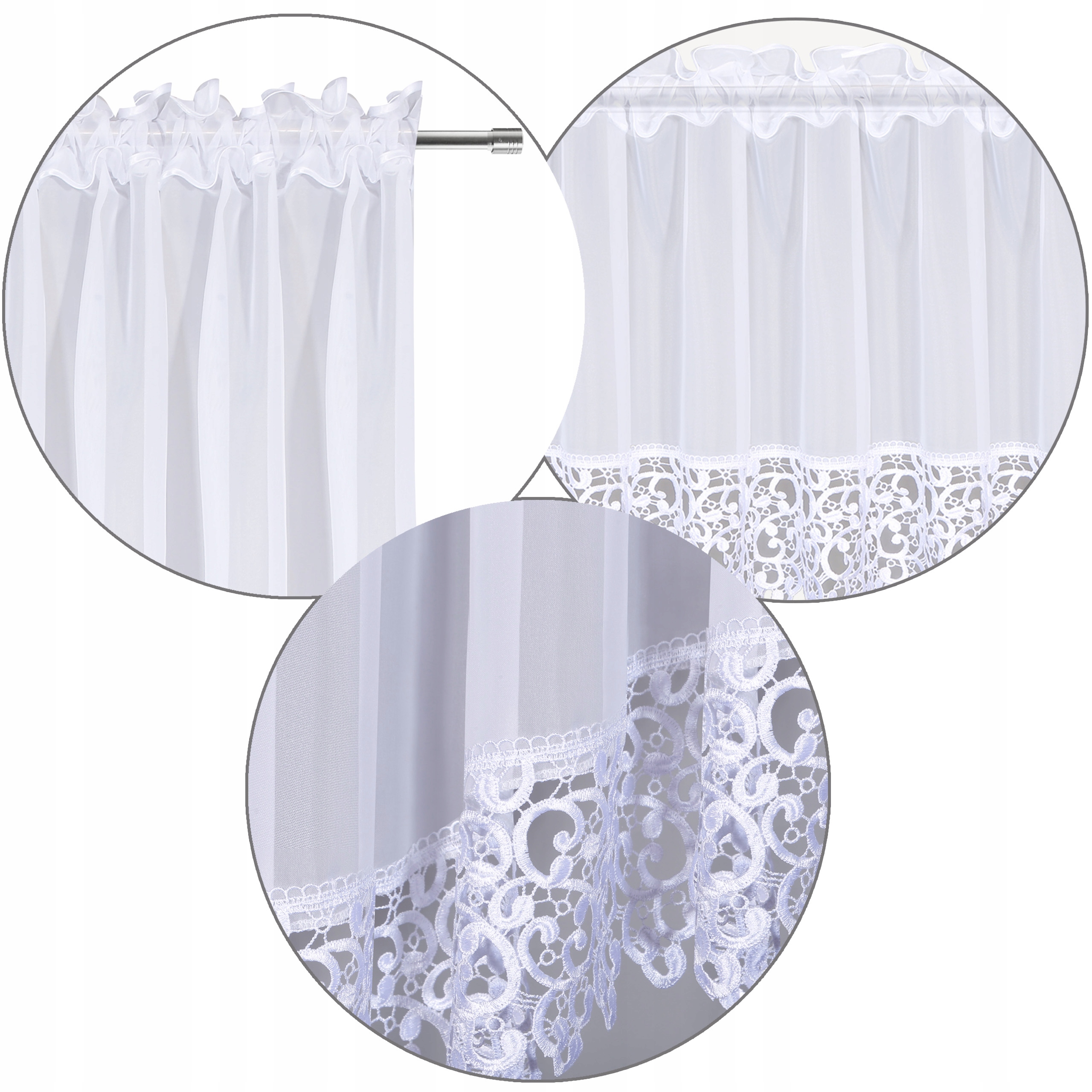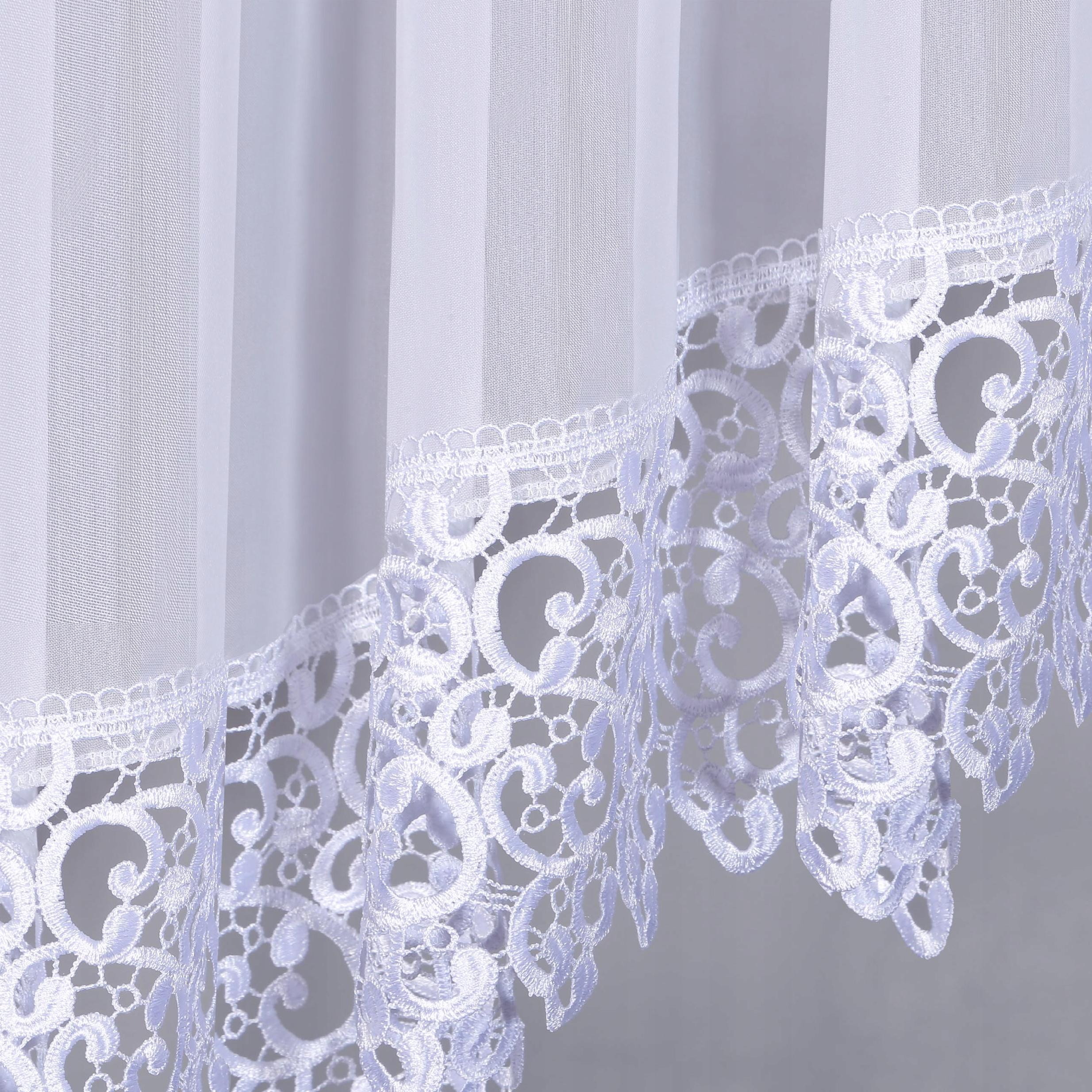 Brzegi firany wykończone zostały białą lamówką, a w jej dolnej części znajduje się piękna gipiura o szerokości 15 cm.