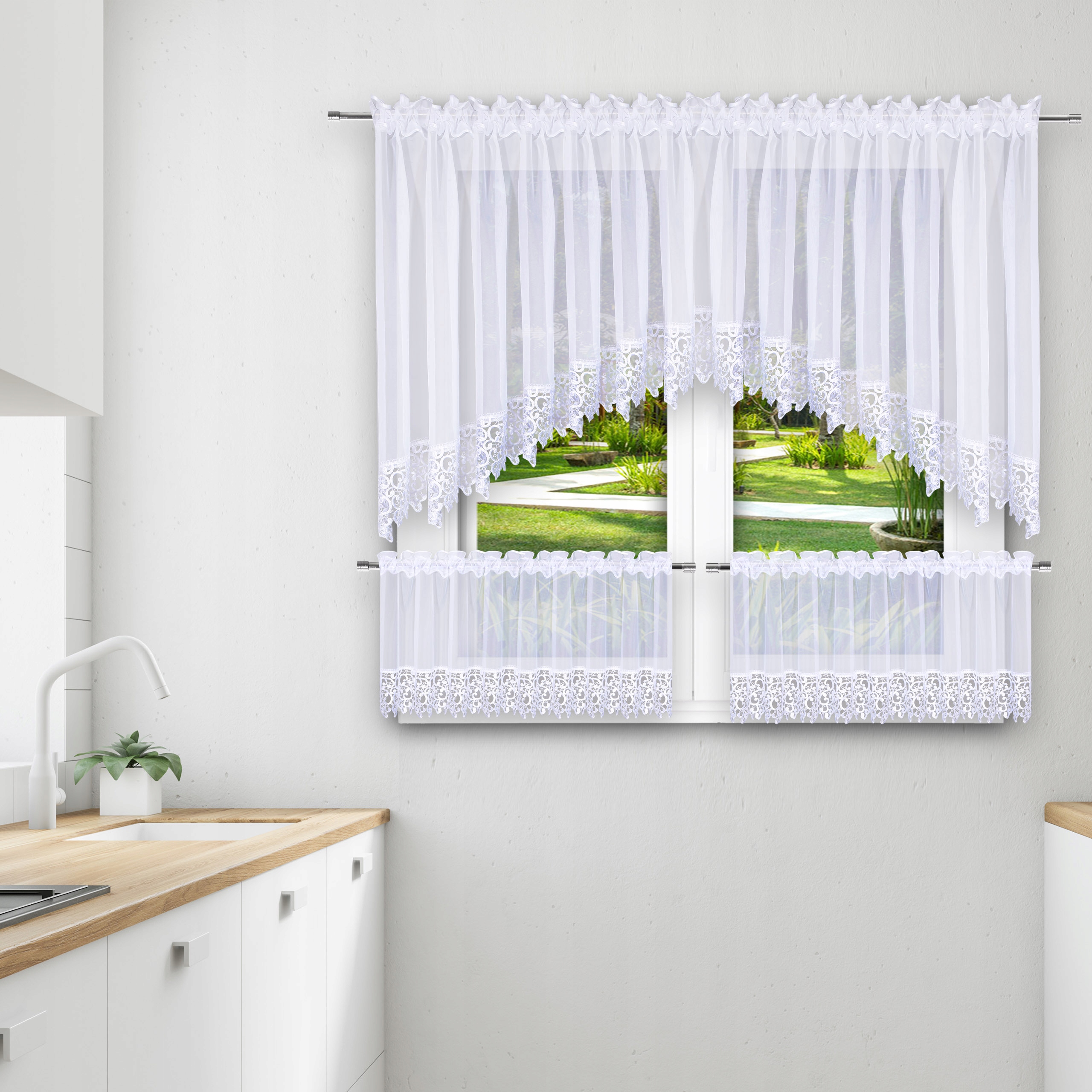 Firana w łuk z woalu wraz z zazdrostką uzupełni dekorację okna zarówno w stylu klasycznym, jak i nowoczesnym. Idealnie nadaje się do kuchni, salonu, sypialni, jadalni lub pokoju dziecięcego. Elegancka gipiura z pewnością nada wnętrzu stylowego charakteru.