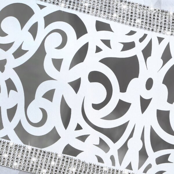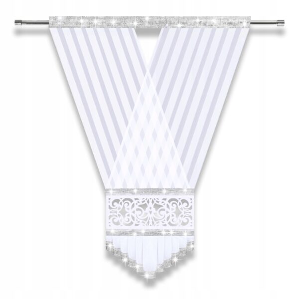 Dekoracyjny panel okienny typu V z wysokiej jakości półprzezroczystego woalu. U dołu zdobiony filcowym ażurem, który w miejscu łączenia z woalem obszyty jest pasami z cyrkoniami.