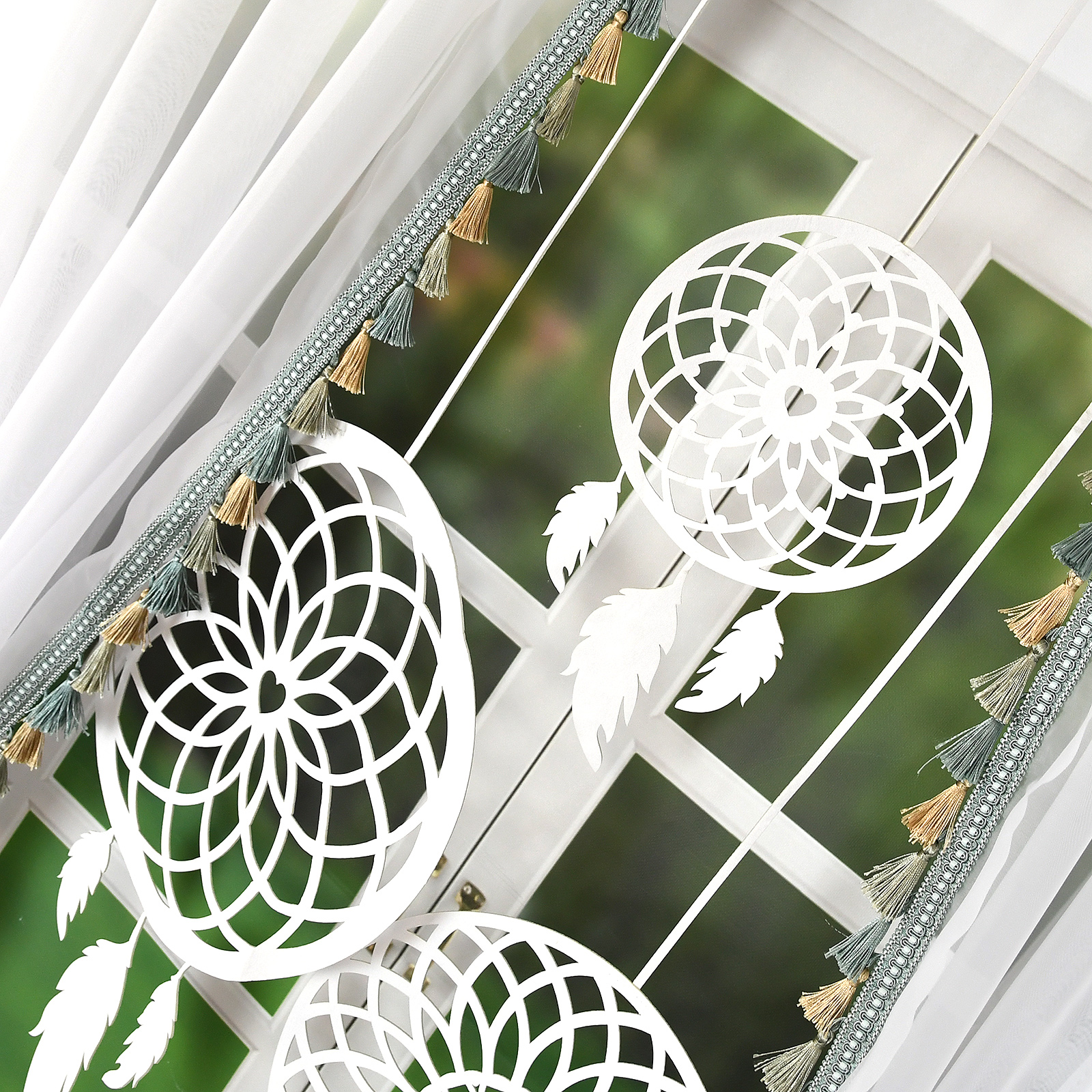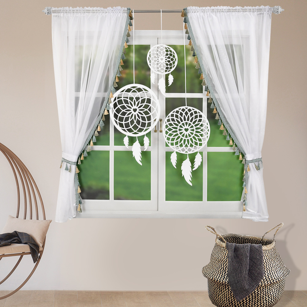 Zestaw 2 firan w stylu boho dekorowanych frędzlami, uszytych z woalu, z łapaczem snów