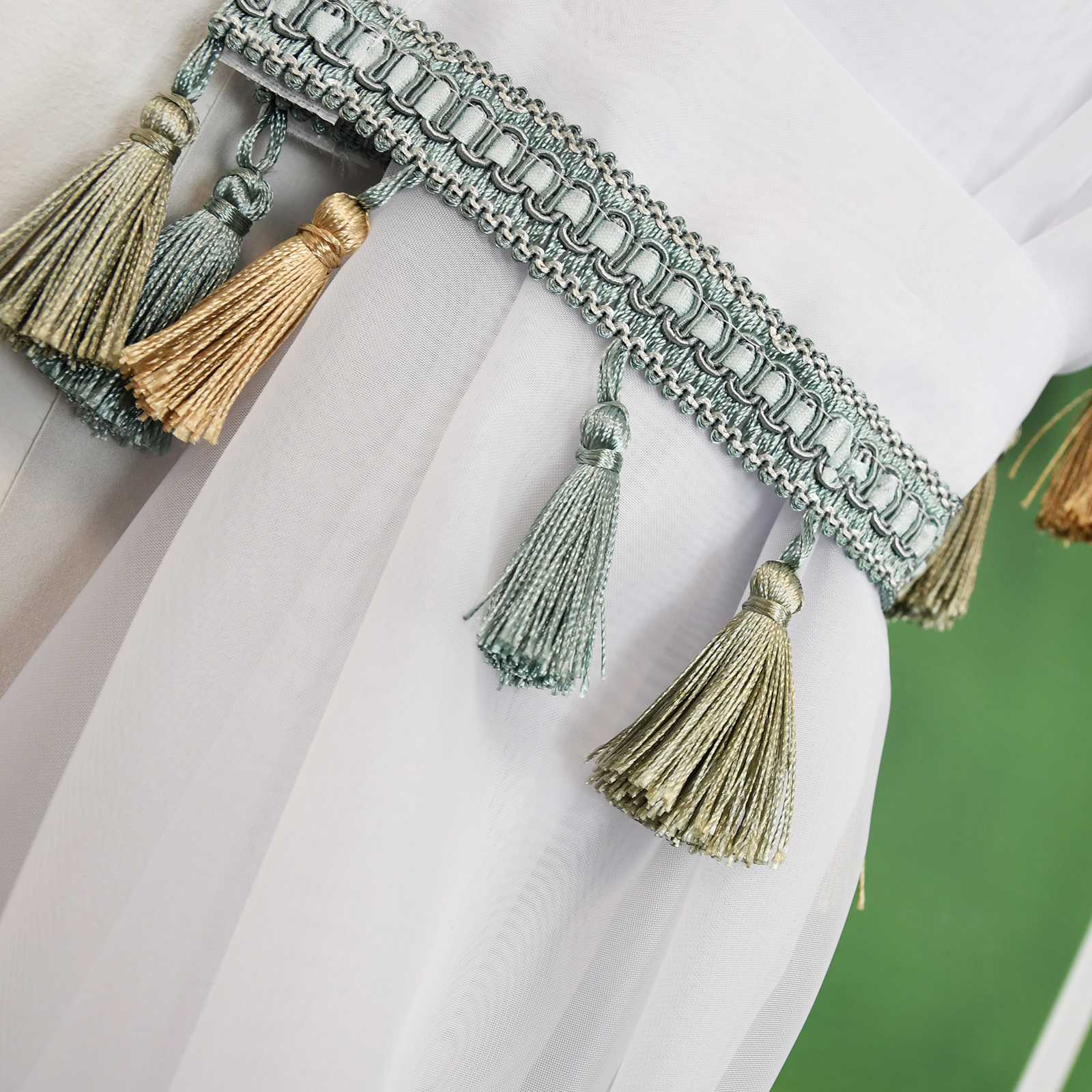 Firana uszyta jest na tunelu i taśmie marszczącej, która umożliwia zawieszenie zestawu bezpośrednio na karniszu rurkowym, żabkach bądź haczykach, panel posiada tunel. Firana udekorowana jest modnymi frędzlami w stylu boho.
