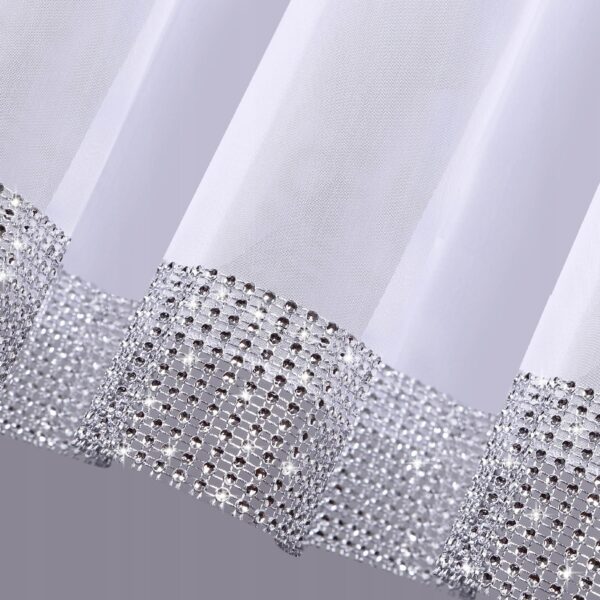 Elegancka, krótka firana uszyta z wysokiej jakości woalu. Ozdobiona u dołu taśmą z cyrkoniami o szerokości 6 cm, które bardzo ładnie połyskują w słońcu, co nada wnętrzu luksusowego charakteru.