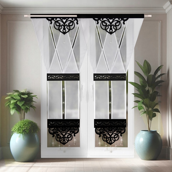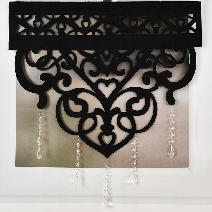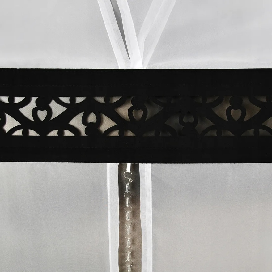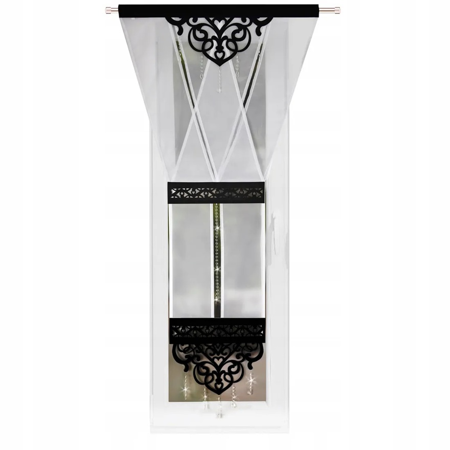 Panel typu V-ka, wykonany z półprzezroczystego woalu, ozdobionego ażurowymi wstawkami oraz pięknymi delikatnymi koralikami. Efektowny wzór ażurowy nadaje całości wyjątkowego stylu. U góry znajduje się wszyty tunel na karnisz rurkowy (brak wszytej taśmy marszczącej). Ażurowy panel wykonany jest z dobrej jakości grubego filcu.