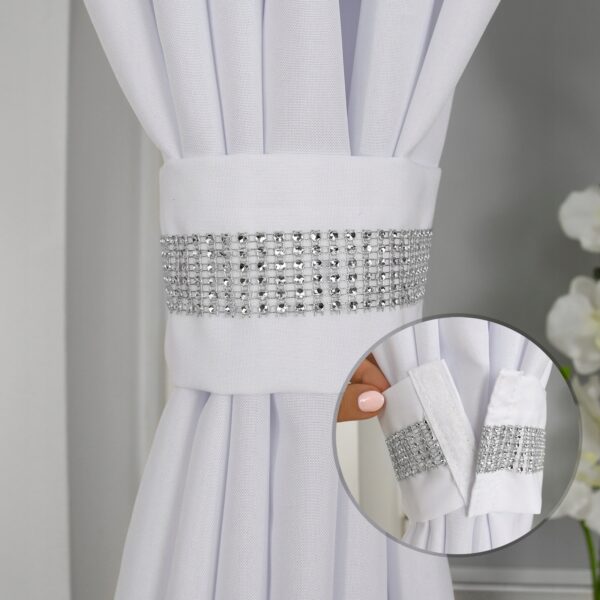 Dół panelu ażurowego udekorowany jest taśmą z koralikami. Zasłony można upiąć w kokony za pomocą tasiemek z cyrkoniami (w zestawie).