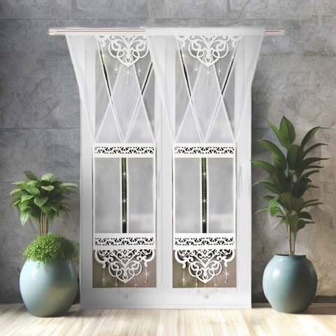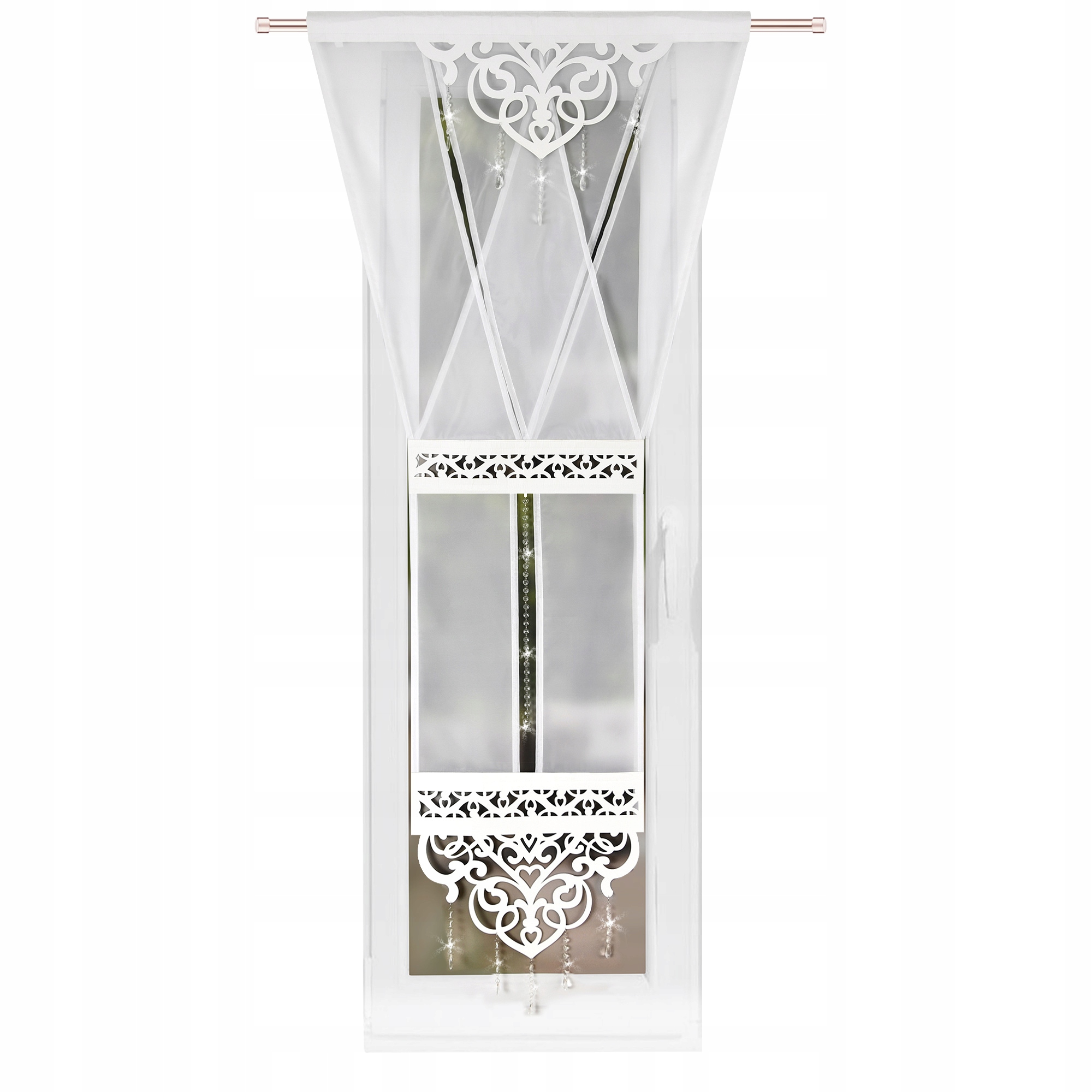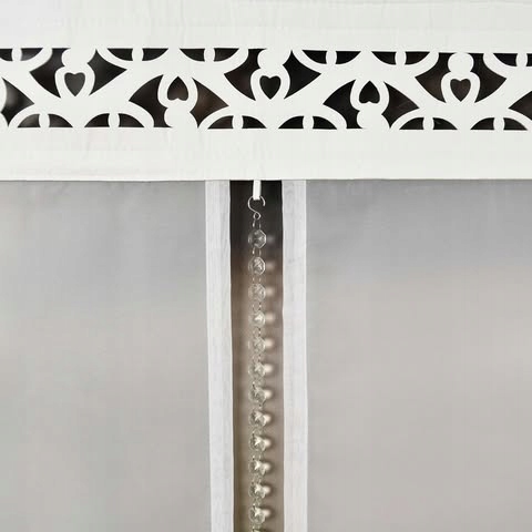 Panel typu V-ka, wykonany z półprzezroczystego woalu, ozdobionego ażurowymi wstawkami oraz pięknymi delikatnymi koralikami. Efektowny wzór ażurowy nadaje całości wyjątkowego stylu. U góry znajduje się wszyty tunel na karnisz rurkowy (brak wszytej taśmy marszczącej). Ażurowy panel wykonany jest z dobrej jakości grubego filcu.